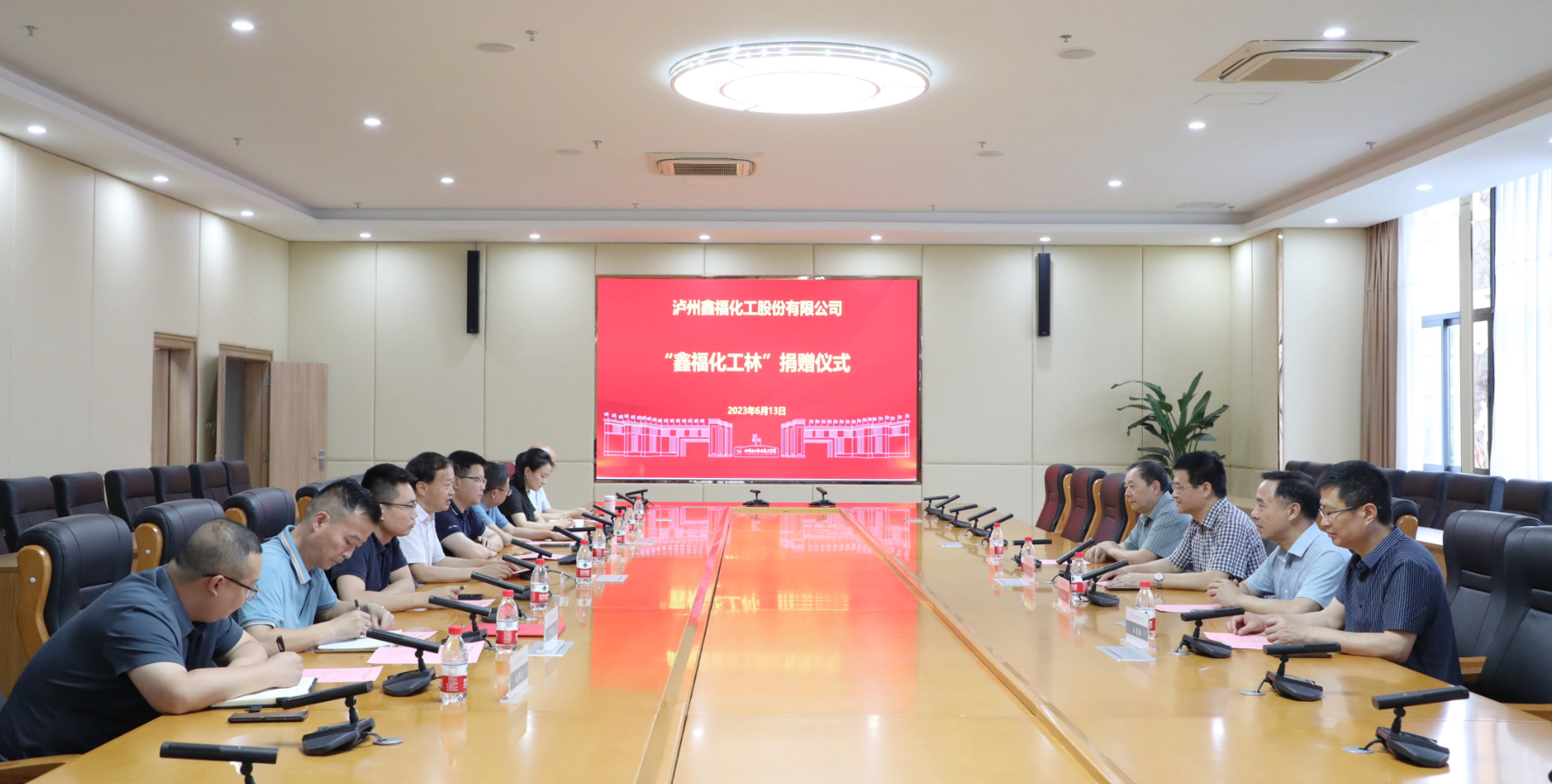 2023年6月13日下午,泸州鑫福化工股份有限公司“鑫福化工林”捐赠仪式在学校综合办公楼107会议室举行。泸州鑫福化工股份有限公司党委书记、董事长、总经理、学校1991届有机化工专业优秀校友聂勇,副总经理、学校1993届有机化工专业优秀校友王文俊,总工程师、学校1982届有机化工专业优秀校友封小洪,学校党委书记刘志勇,党委副书记、院长文申柳,党委委员、副院长谢光杰参加捐赠仪式。仪式由学校党委委员、副院长邓启华主持。