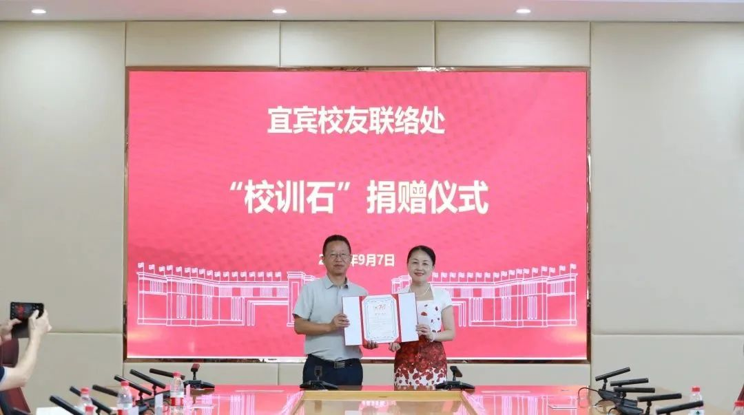 仪式上,蒲开伦代表学校向劳谦益颁发了宜宾校友联络处“校训石”捐赠证书。
